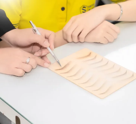 Trước khi thực hiện trên người thật, bạn cần luyện tập trên da giả để làm quen với máy phun xăm và rèn luyện kỹ năng đi kim. Hãy tập cách tạo ra những đường nét sắc sảo, dày dặn và độ cong chuẩn xác. Đây là bước quan trọng giúp người học xăm chân mày làm quen với kỹ thuật.